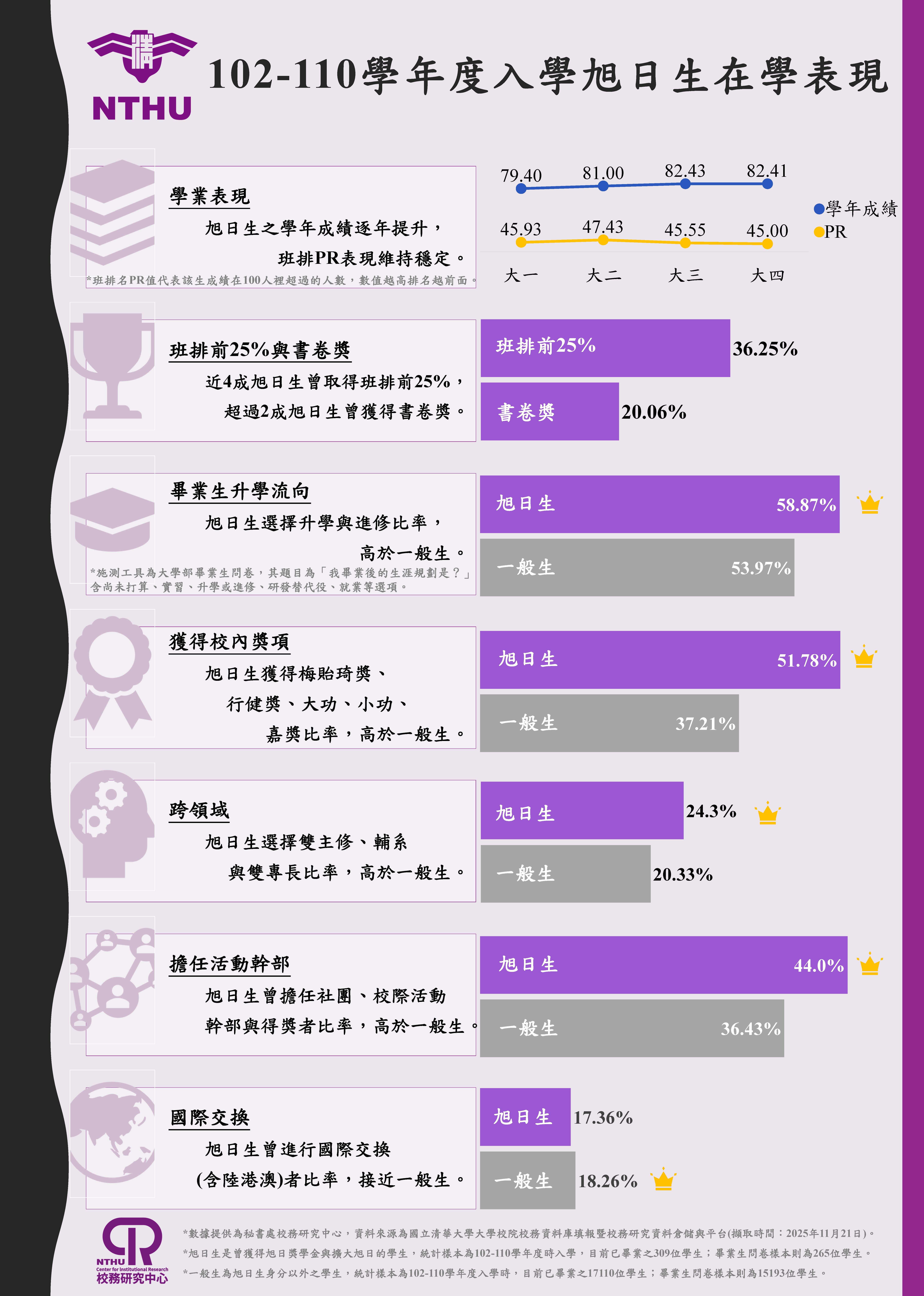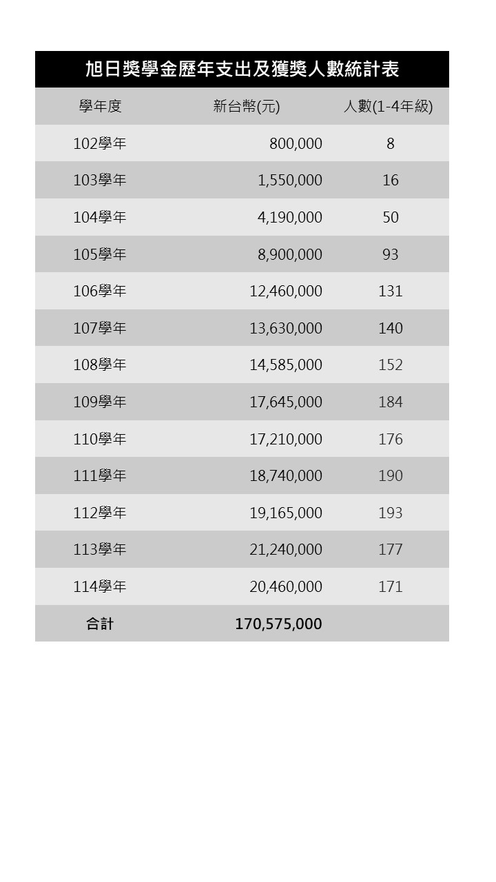 本校每年錄取旭日獎學金,114學年度得獎人數達171名,發放之獎學金合計已逾1.7億元,將是國內大學經濟不利獎學金之最,顯示清華扶弱成效卓越,翻轉社會底層的動能已然啟動。