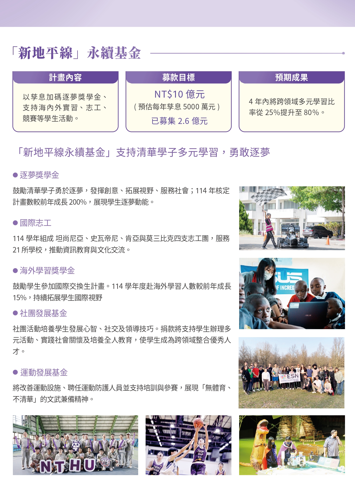 捐款將以孳息加碼逐夢獎學金、支持海內外實習、志工、競賽等學生活動。